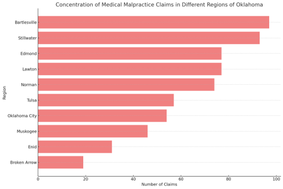 The geographical distribution of medical malpractice claims in Oklahoma reveals that certain regions experience higher claim rates than others. Major urban centers like Oklahoma City and Tulsa see the highest number of claims, reflecting their larger populations and more extensive healthcare facilities.